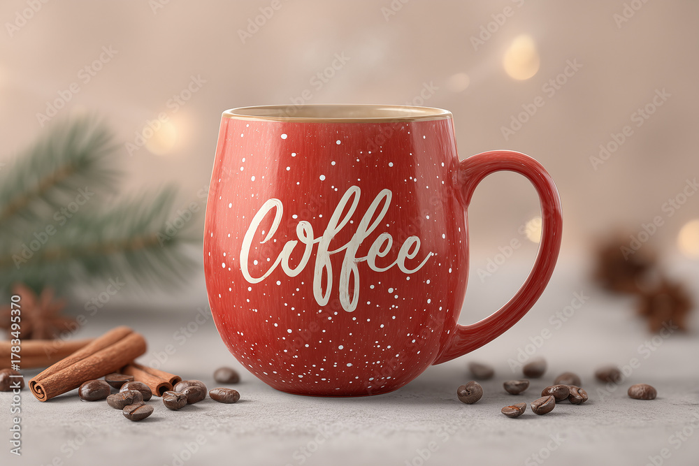 • Czerwony kubek z napisem "Coffee" na środku, ozdobiony białymi cętkami, stoi na blacie w otoczeniu ziaren kawy, cynamonu i świątecznych dekoracji.