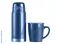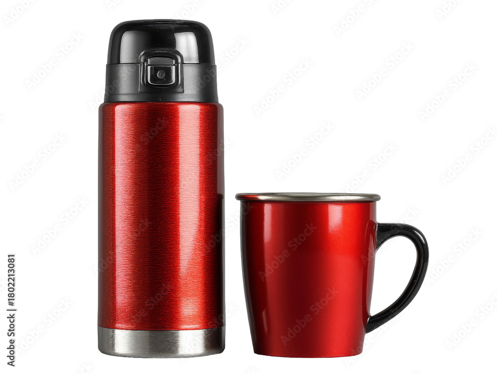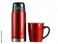 • Czerwony termos i kubek metalowy – zestaw podróżny na napoje