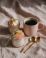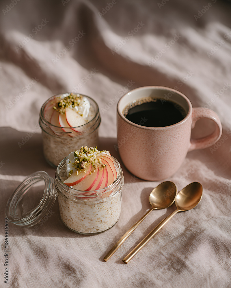 • Płatki owsiane z jogurtem w słoiczkach, kawa w kubku i złote łyżeczki na lnianej tkaninie, domowe śniadanie i styl życia.
