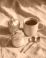 Kawa - Płatki owsiane z jogurtem w słoiczkach, kawa w kubku i złote łyżeczki na lnianej tkaninie, domowe... #1866615937
