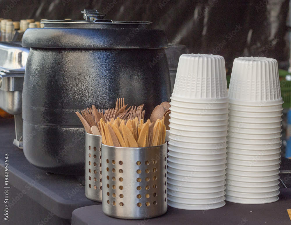 • Stoisko z gorącym napojem na wynos, termosy i stos kubków jednorazowych, drewniane mieszadełka, catering w plenerze.