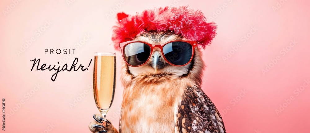 • Stilvolle Eule feiert Silvester mit Sekt und feiert das neue Jahr
