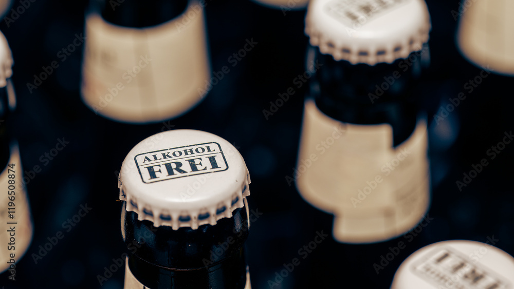 Alkohol - Bottlecap of beer bottle with label that spells "alcohol free" in German "Alkohol frei" #1196508874