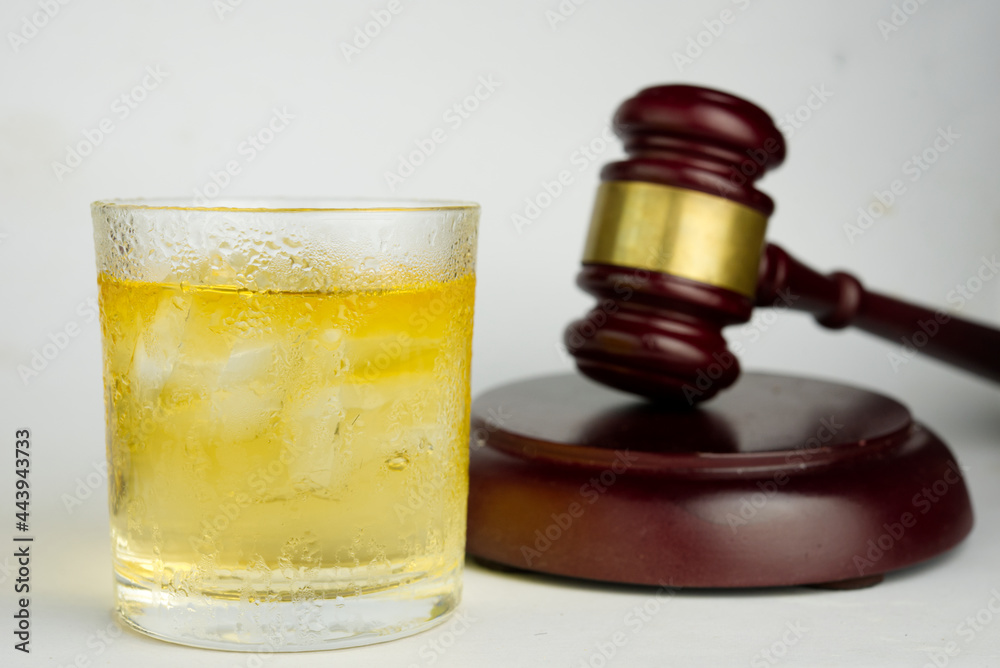 Alkohol - Alcohol offenses concept.Glass of whiskey with gavel hammer background. #443943733