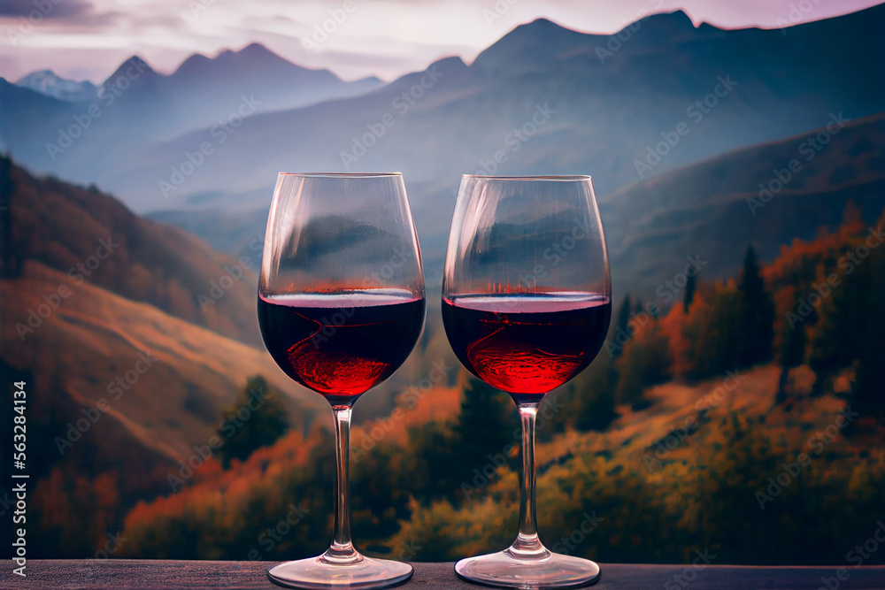 Alkohol - Zwei Gläser Rotwein. Fantastische Aussicht auf die Weinberge im Hintergrund - Generative Ai #563284134
