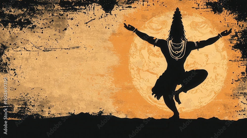 • Shiva performing Natarajasana lord of the dance pose, balancing on one leg, symbolizing the dance of cosmic creation and destruction, Shiva, yoga, cosmic dance