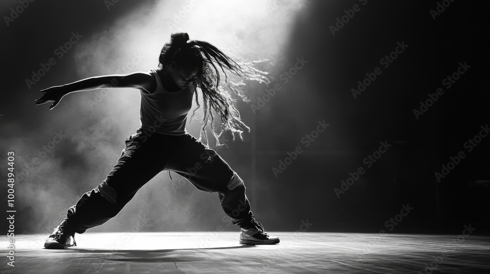 Taniec - A female dancer with dreadlocks performs a hip hop dance move in a spotlight. #1004894403