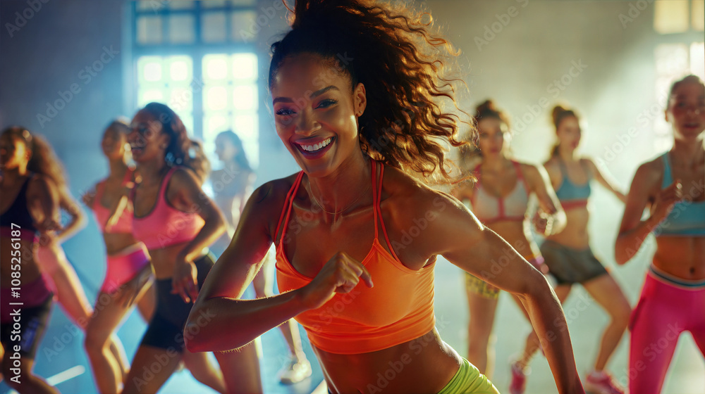 Taniec - Energetic dance fitness class with happy participants in vibrant outfits. Zumba Dance Class #1085256187