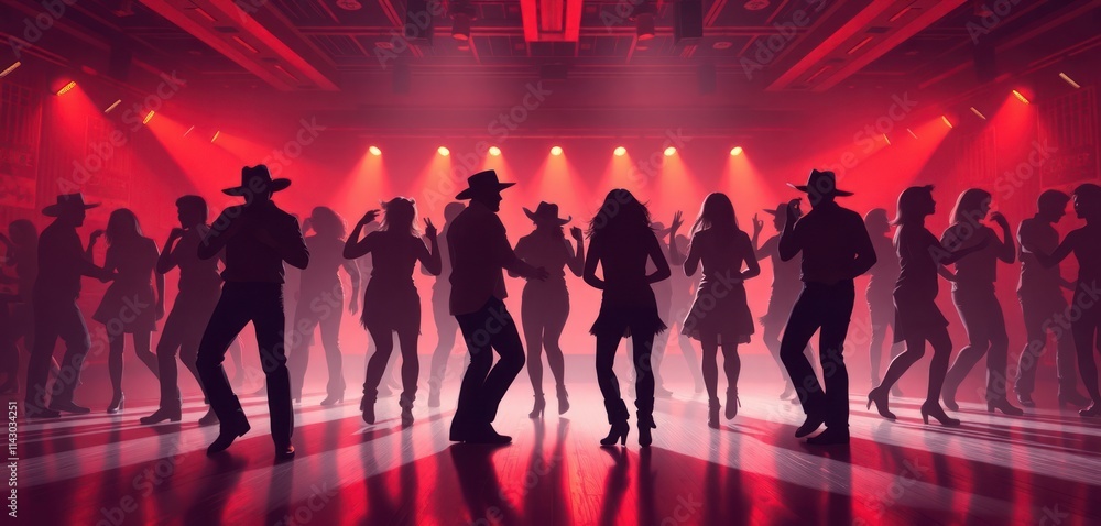 • Group of people dancing in nightclub. Country line dancing. Silhouette style illustration with red lighting, spotlights. Many dancers wearing cowboy hats, western style clothes. Energetic atmosphere