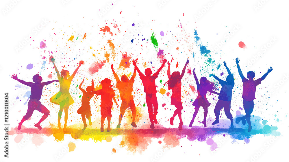 Taniec - An icon of a playful Holi scene with people dancing and throwing colors on a white background #1210011804