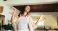 • Woman, happy and dancing in home with music, relax and comic in living room with memory in morning. Person, girl and smile with rhythm, excited and talent with joke, crazy and playful at apartment