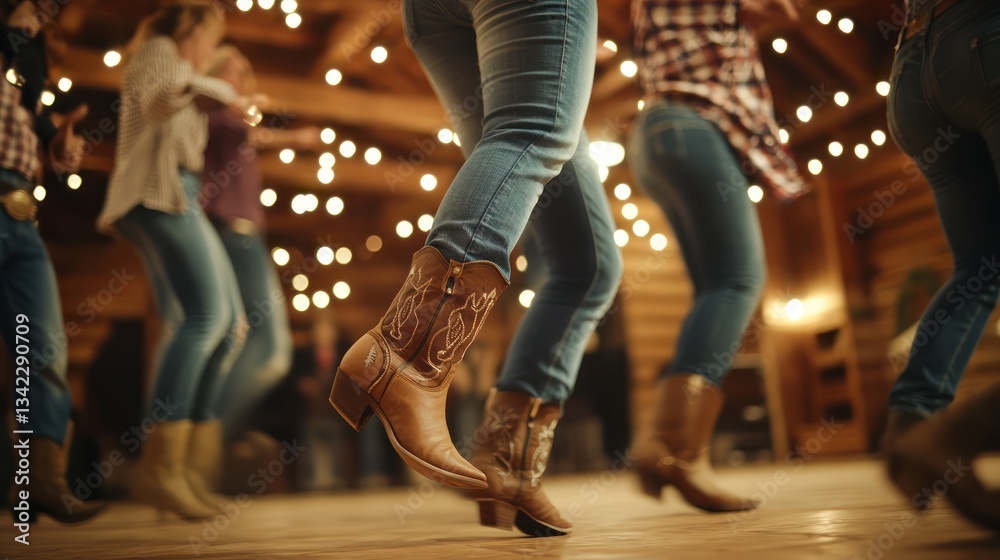 Taniec - Women line dancing rustic barn, festive lights, party #1342290709