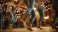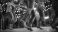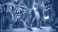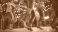 • Women line dancing rustic barn, festive lights, party