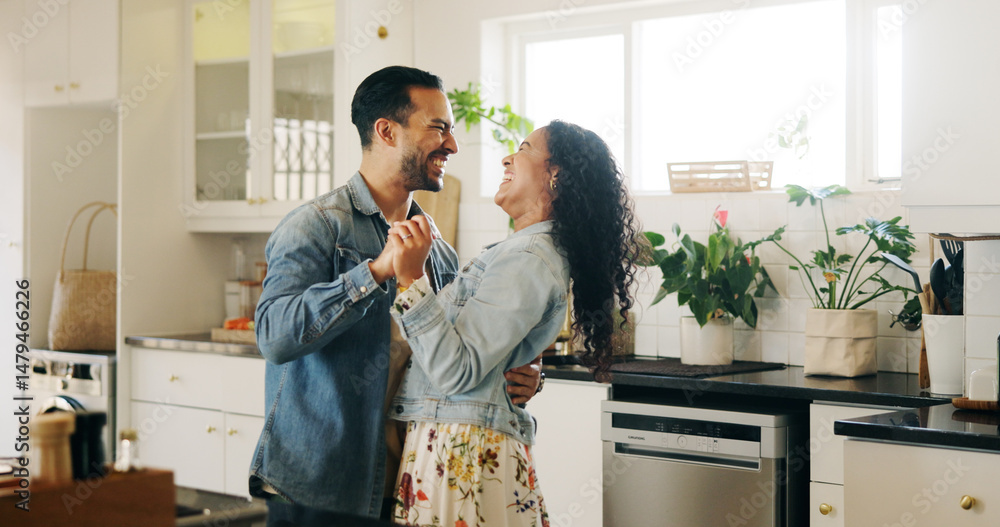Taniec - People, couple and laugh with dancing in kitchen for anniversary celebration, bonding and fun.... #1479466226