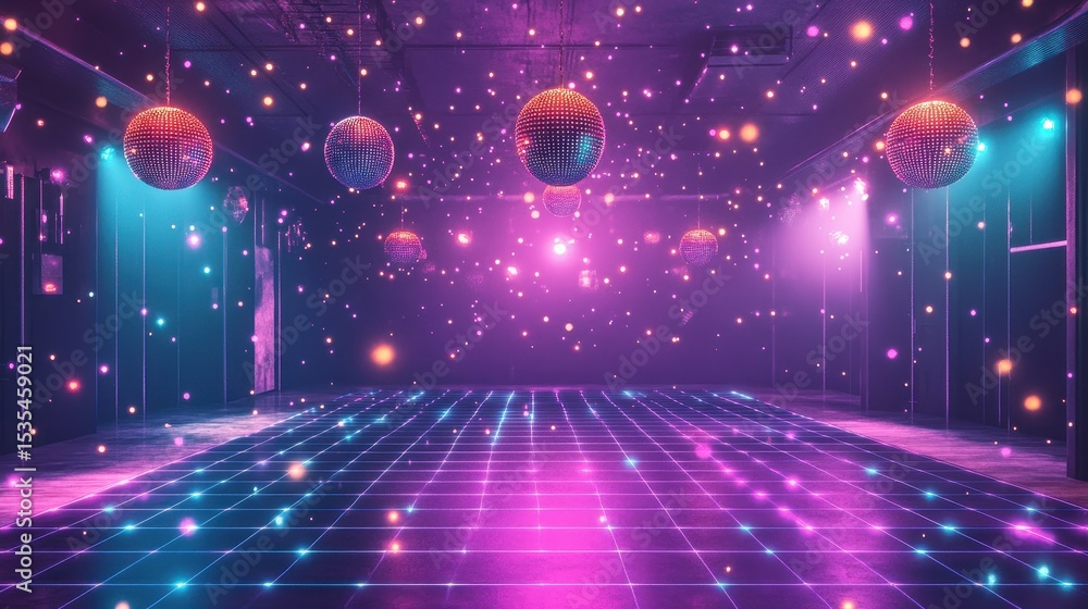 • Retro style disco room with mirror balls, neon floor grid, and sparkling lights. A vibrant space evokes 1980s dance party atmosphere, perfect for entertainment and celebration themes.