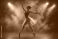 Taniec - Graceful ballerina silhouette performing on stage with atmospheric smoke and dramatic spotlights #1548386414