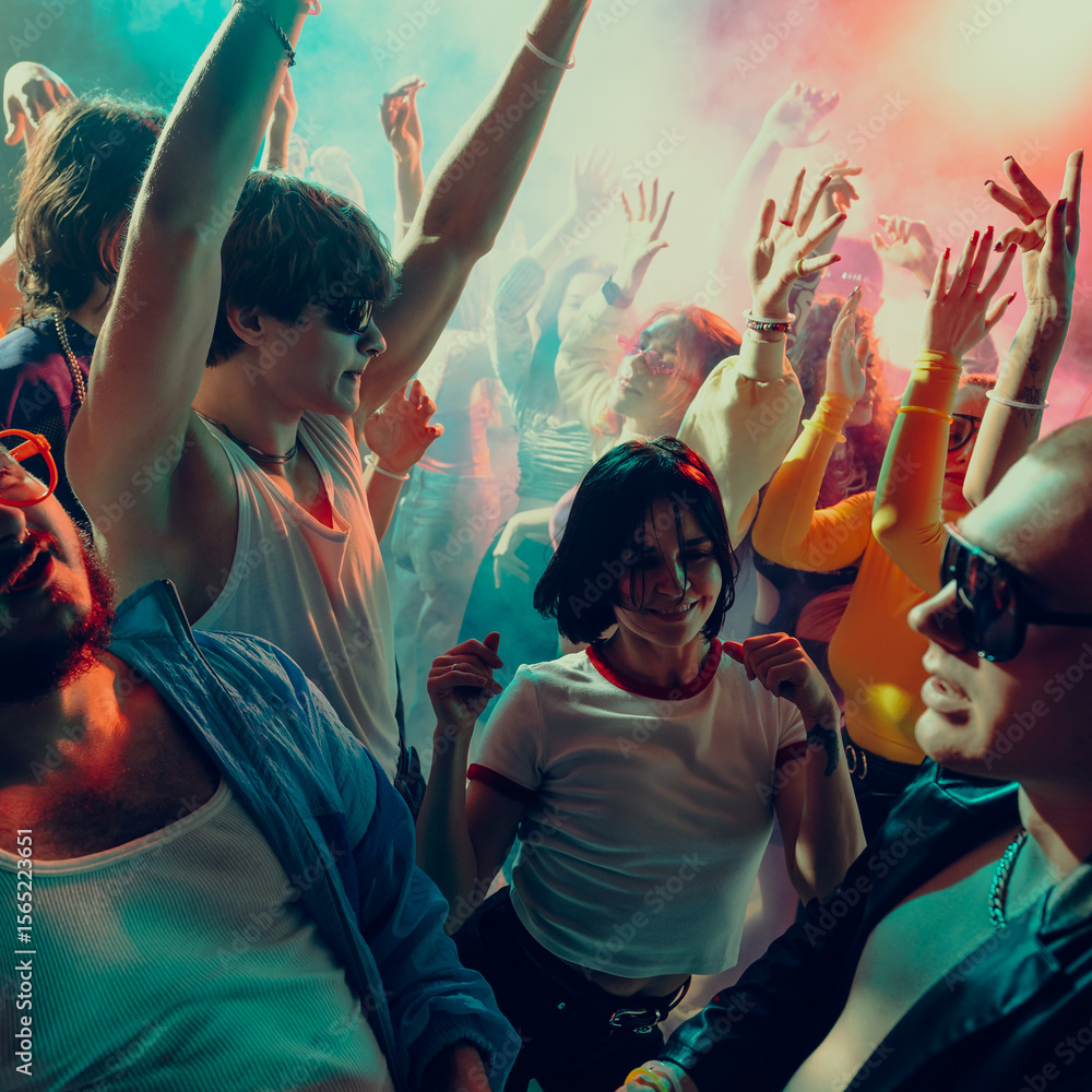 Taniec - Vibrant party scene with diverse crowd dancing under colorful lights. Concept of nightlife,... #1565223651