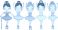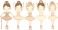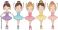 • Five cute cartoon ballerinas in colorful tutus and ballet shoes performing a dance isolated on transparent background