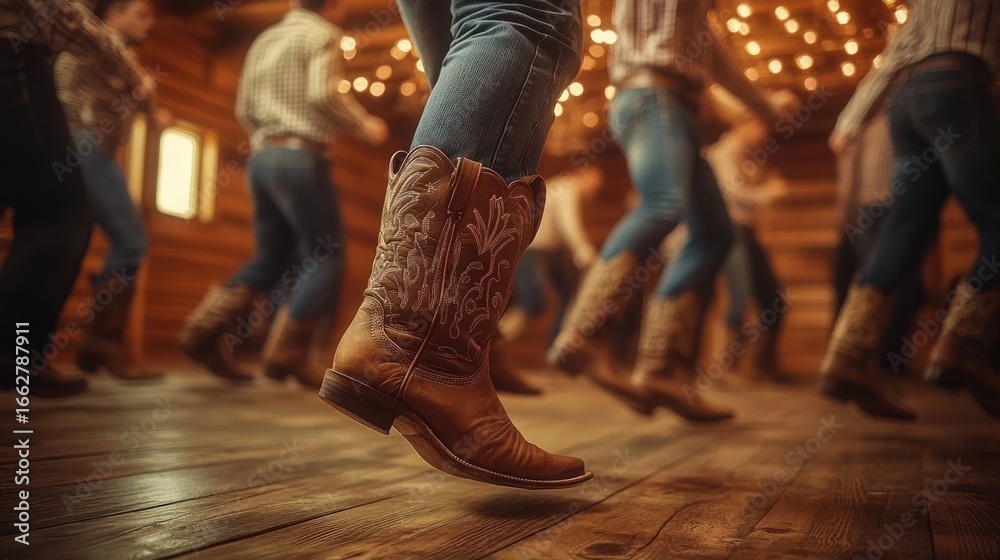 Taniec - Close-up of people wearing cowboy boots and jeans dancing together on a wooden floor in a warmly... #1662787911