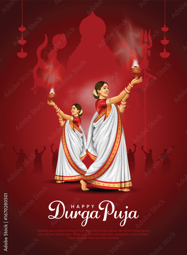 Taniec - illustration of lady performing dhunuchi dance in Happy Durga Puja Subh Navratri Indian religious... #1670280501