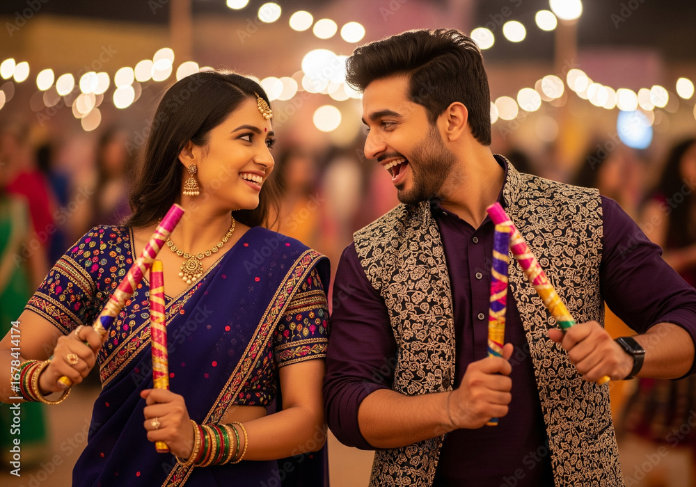 • Navratri celebration: Indian couple laughing together while dancing the Dandiya Raas with sticks at a vibrant Navratri festival celebration.