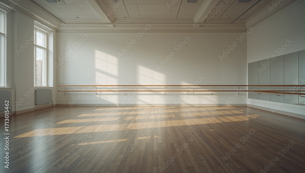 Taniec - Empty dance studio featuring a wooden ballet barre and light-colored walls #1713015462