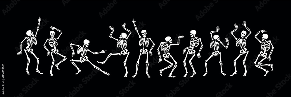 • Happy dancing skeletons. BW vector illustration for Halloween and other