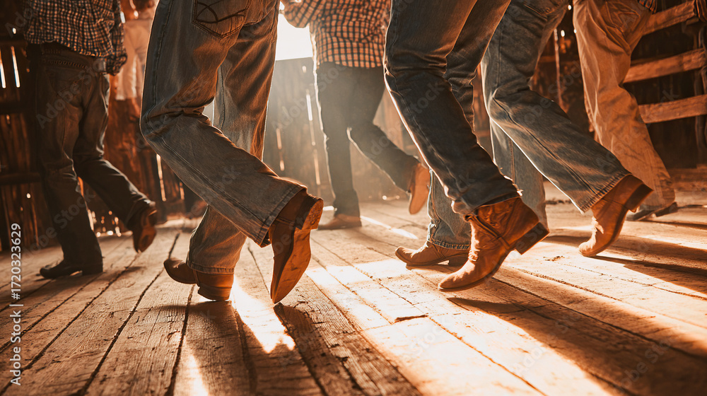 Taniec - Line dancing on wooden floorboards in western attire #1720323629