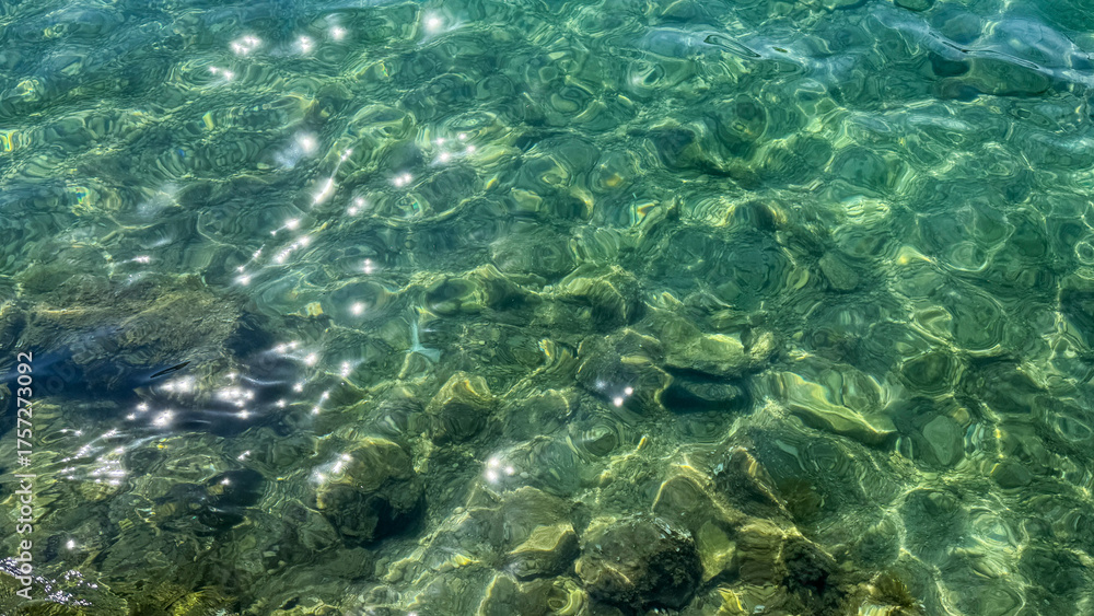 • Sunlit ripples dance upon a mosaic of emerald stones, evoking Midsummer serenades and mystical water sprite folklore