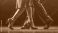 • Close-up of a couple's legs dancing the tango. Woman in red high heels and man in black shoes on a wooden stage floor. Passionate Argentine ballroom dance performance