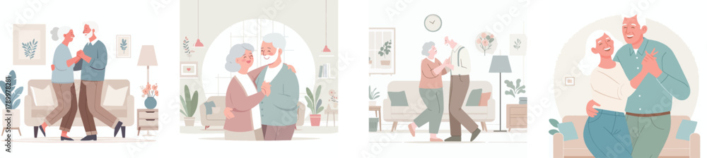 • An elderly couple dancing together in the living room, flat design, simple and minimalistic style, white background