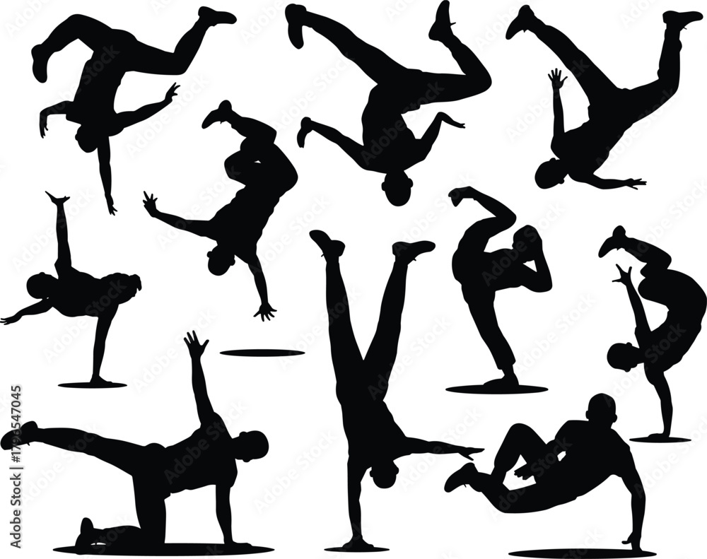 • Breakdancer silhouette vector set, street dance icons, black hip hop clipart, acrobatic pose graphics, urban motion shapes, energetic design elements