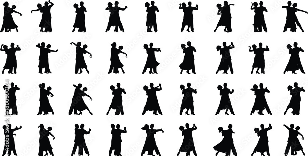 • Ballroom dance silhouettes, elegant couple poses, black dancing figures, romantic movement, graceful choreography, artistic rhythm, stylish performance, classic dance art