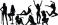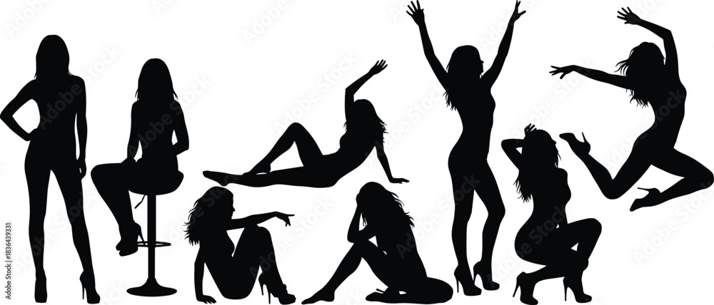 • Set of eight black female silhouettes in various fashionable, seductive, and dynamic posing and dancing stances, isolated on a white background, symbolizing beauty, glamour, and confidence.