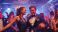 • Elegant couple dancing together at glamorous party celebration with confetti falling and crowd enjoying festive atmosphere with colorful lighting