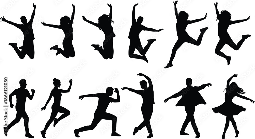 Taniec - Jumping and dancing people silhouettes set expressing freedom, joy and movement, energetic... #1866121050