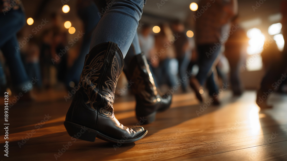 Taniec - Lively group of people in cowboy boots line dancing, wooden-floored hall lit by warm nostalgic... #1893141282
