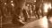 • Lively group of people in cowboy boots line dancing, wooden-floored hall lit by warm nostalgic sunlight, country dance activity, social dancing scene, western dance celebration,