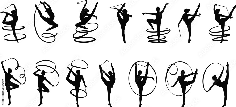 Taniec - Rhythmic gymnastics athlete silhouette set showing ribbon dance poses, flexible movements, sport... #1896273459