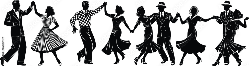 • "Vintage silhouette illustration of couples dancing in 1950s retro attire, showcasing elegant movement, social dance culture, flared skirts, and nostalgic mid-century fashion charm"