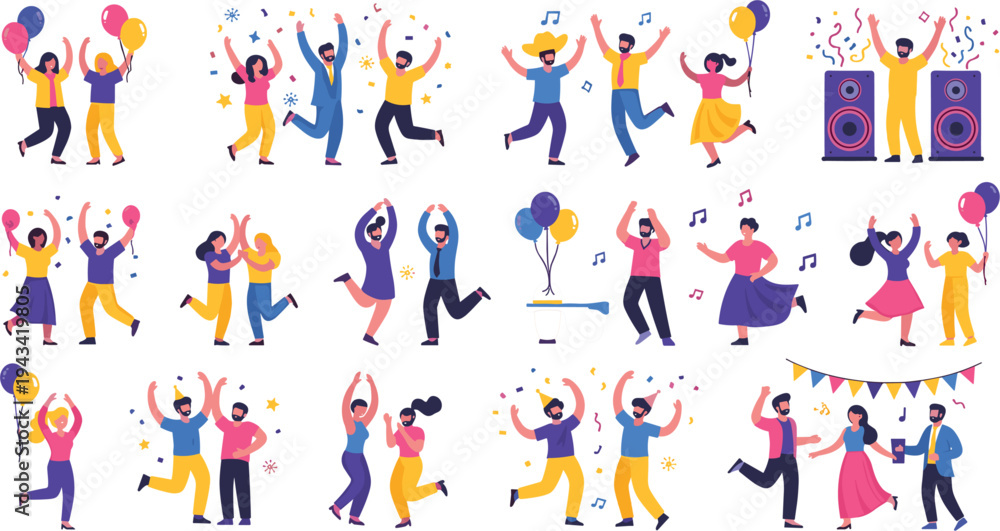 • Party celebration dancing people flat vector illustration set with happy friends balloons music confetti festival dance poses and joyful event scenes isolated design.