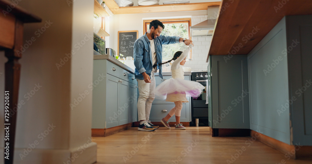 Taniec - Support, love and ballet girl bonding with father in a kitchen together, excited and playing as a... #729920851