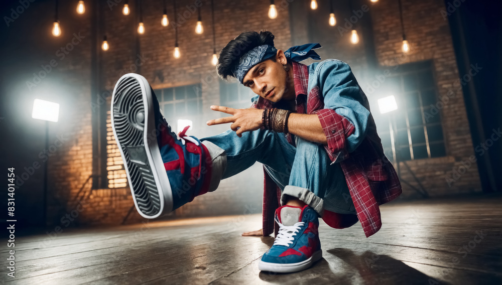Taniec - Photo of a young man dancing hip-hop in the studio #831401454