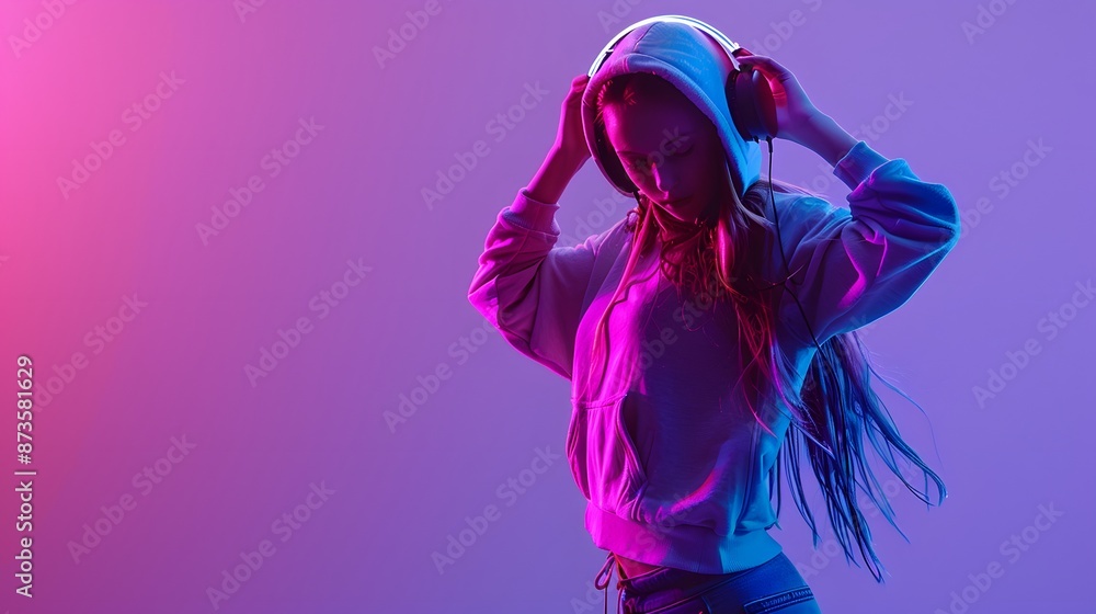 • Stylish fashion teenager model wearing hoodie and headphones listening dj music dancing in purple neon lights. Young teen girl enjoy cool music 90s party mix in violet studio background. Copy space.