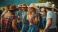 • People are dancing joyfully in cowboy attire at a country dance gathering, showcasing vibrant smiles and spirited energy under the evening sky.