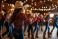 • Cowgirls line dancing in a rustic barn during an evening country dance event