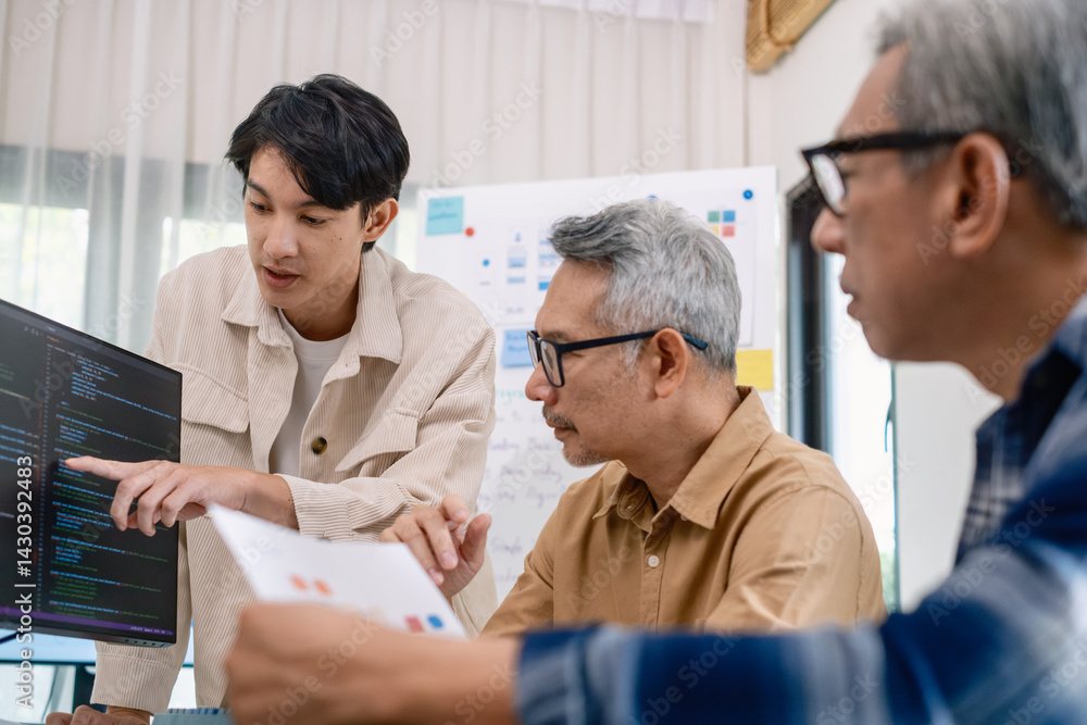 Sport - Group of asian senior in a collaborative software development analyzing flowcharts during a... #1430392483