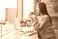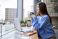 Sport - Happy calm lady student enjoying warm hot drink with mug in hands working or studying online.... #1767009636
