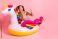 • Young woman riding a unicorn inflatable float in a pink studio smiles and poses for fashion lifestyle and party promo