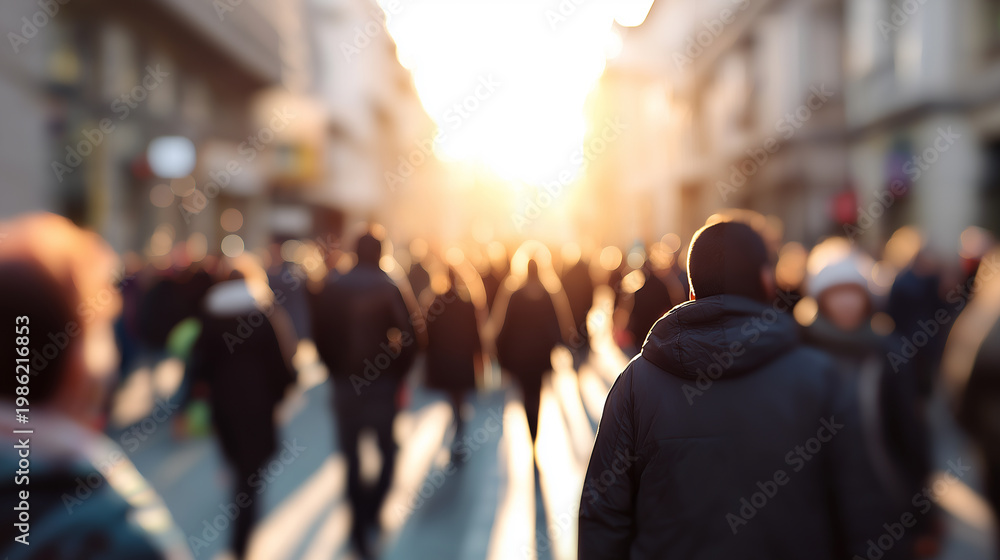 Sport - Crowd of people walking toward bright sunlight in a city street, representing urban lifestyle,... #1986216853